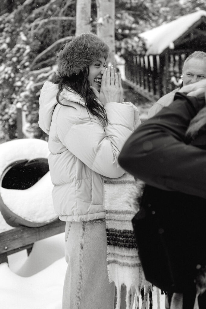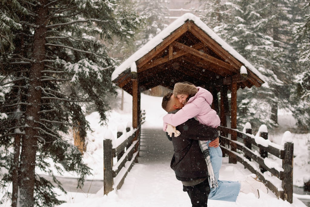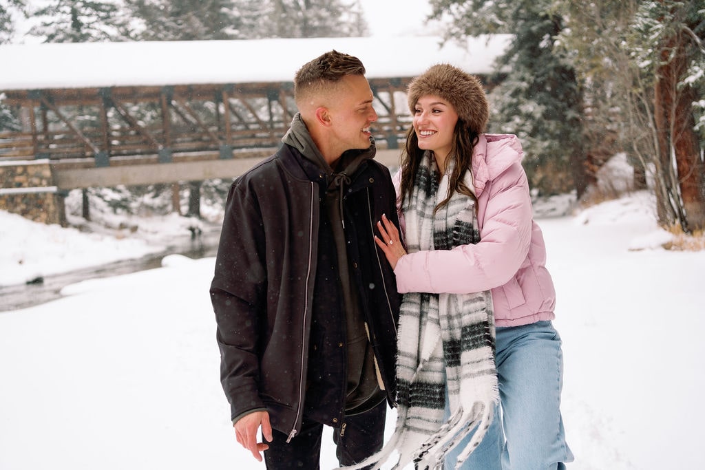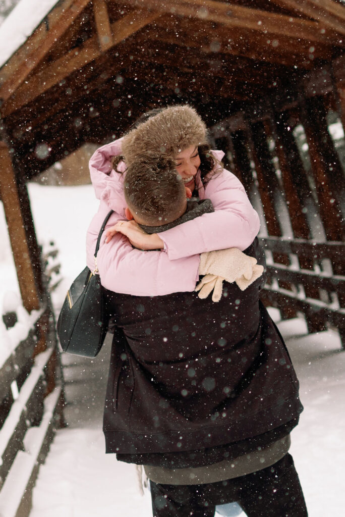 Even though the surprise didn’t go exactly as planned, Ty got down on one knee by the bridge surrounded by a winter wonderland, and Peri said yes with the biggest, happiest tears in her eyes.